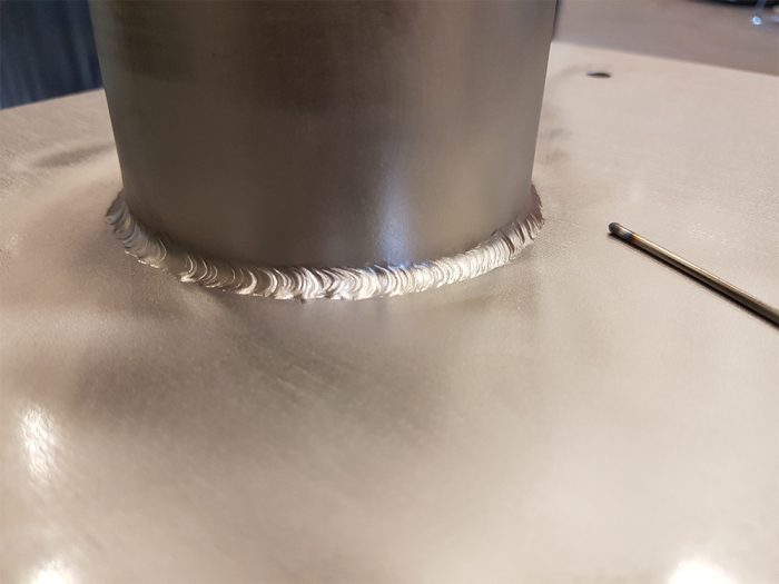 Det blir ofta TIG-svetsning då den blir gnistfri och gör att den kan användas i känsliga miljöer. Här rostfritt stål till en virkestork.